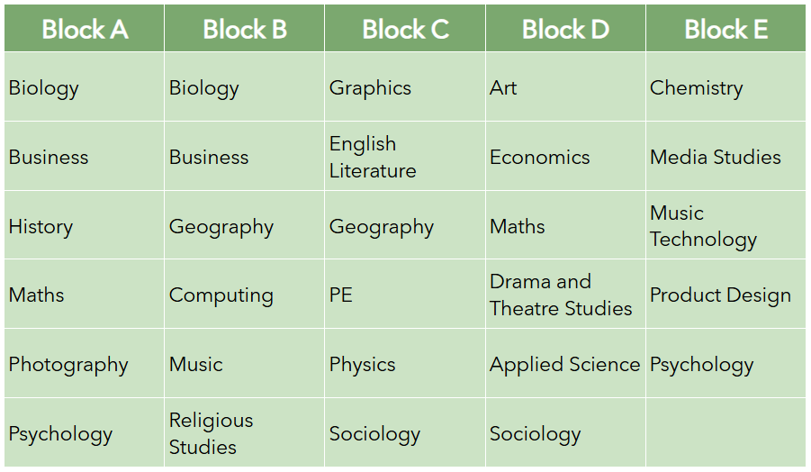 After we publish our subject option blocks, we then invite full e-applications from students. We ask students to select the three subjects they want to take in Sixth Form. Each of their three subjects must come from a different option block.